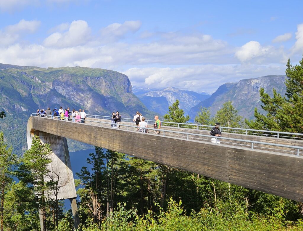 Continue to Sogndal and then along Sognefjord to Lærdal. Here you have two options: drive through the Lærdal Tunnel (the longest road tunnel in the world) or take the scenic “Snow Road” over Aurlandsfjellet. The latter takes 1–2 hours longer but includes the Stegastein viewpoint, which is absolutely worth it. The mountain road is very narrow and runs along steep mountainsides. If you’re driving a large campervan, afraid of heights, or nervous about reversing for oncoming traffic – this is not the road for you.