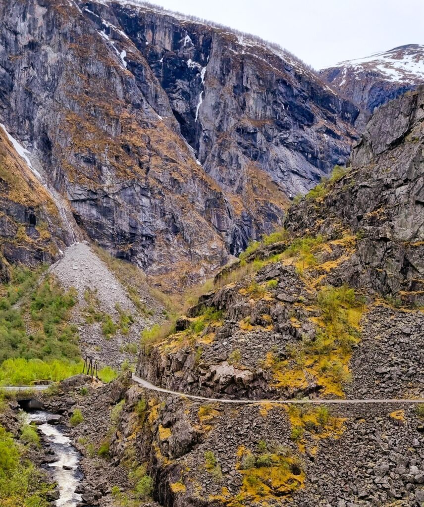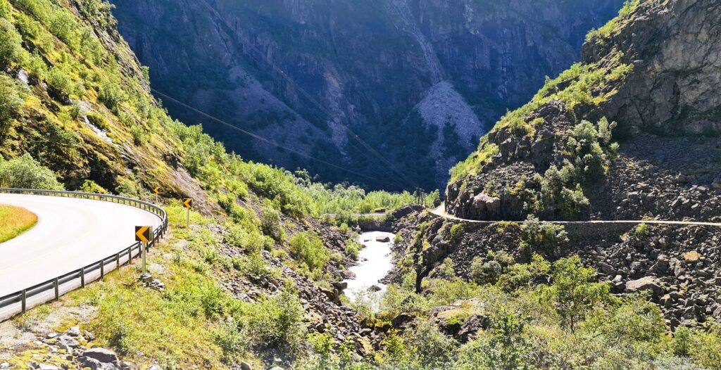 After the drama of Vøringsfossen, the road begins its spectacular descent through Måbødalen valley – one of Norway’s most dramatic stretches of road. Here, the engineers faced near-vertical cliffs and solved the challenge by carving spiral tunnels inside the mountain, looping down to reduce the steepness of the drop. Driving through them feels like descending into the heart of Norway itself.